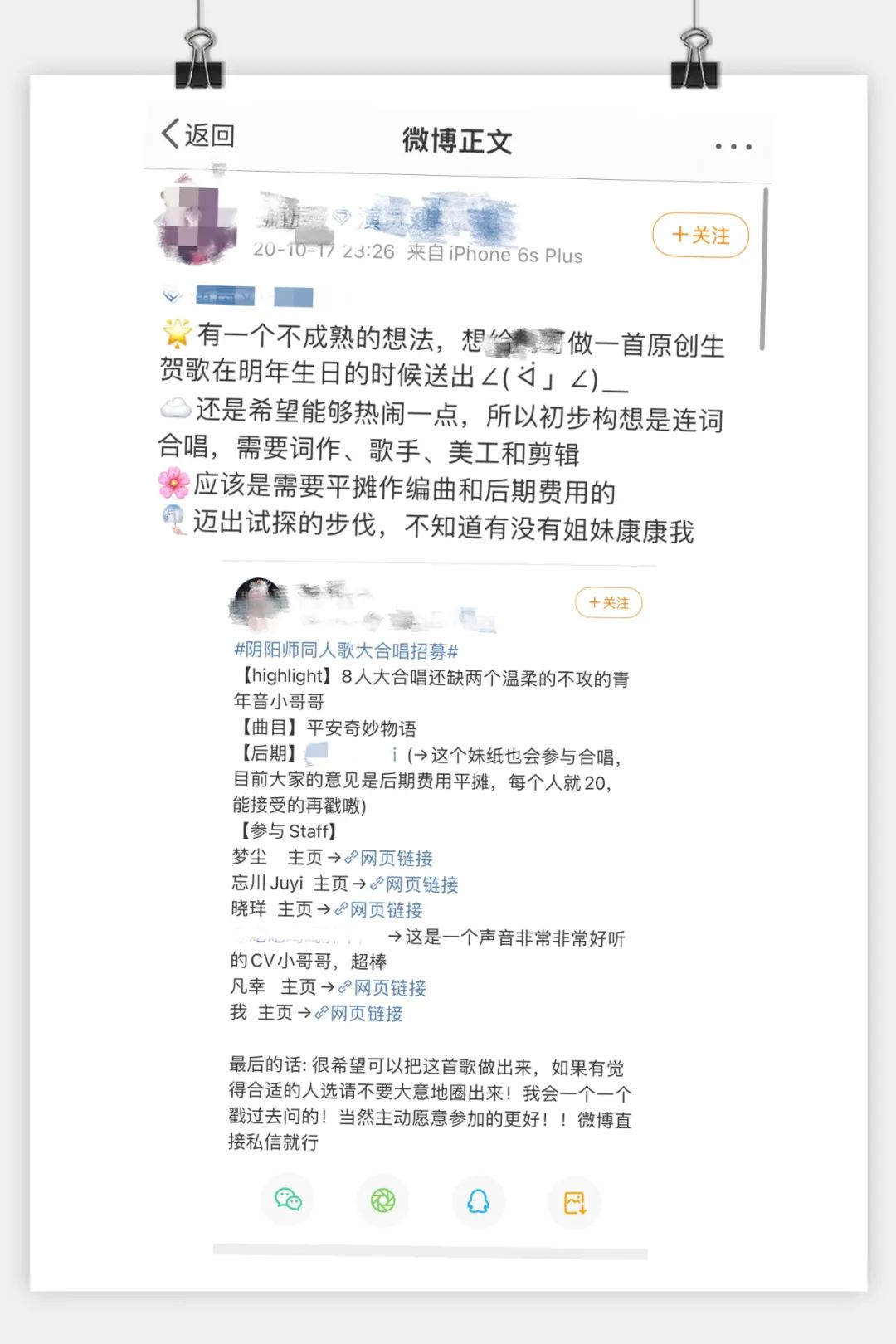 很多独立音乐人的二次元创作和三次元的工作学习生活互不干扰。类似于微信这种熟人社交平台并不适合二次元沟通,他们会带着圈名“马甲”在陌生人社交平台(例如微博)进行创作交流。据了解,微博也是线上音乐社团招新、合作者招募的重要平台,平台的松散型人际联系则依托Z世代聚集的QQ群得以加强。