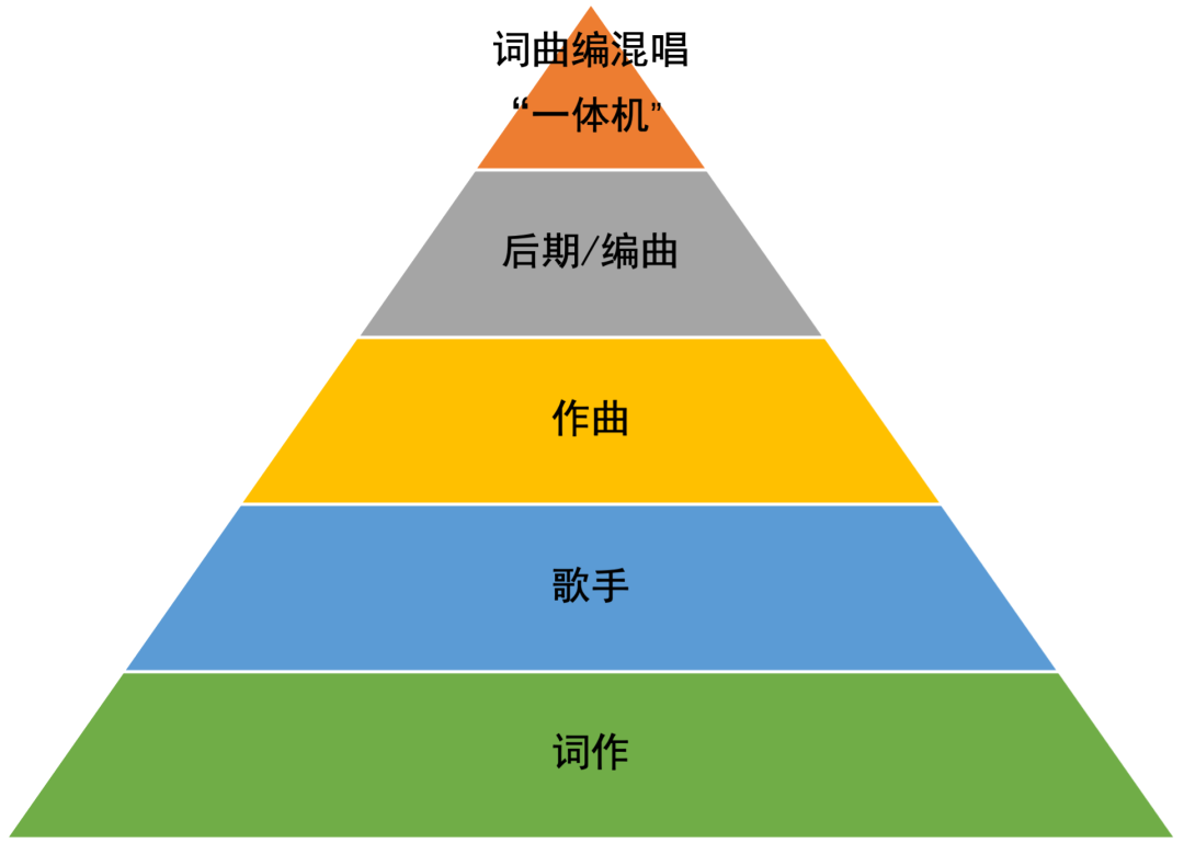 目前,因为创作工种的供需数量差别和技能、设备要求不同,独立音乐人参与歌曲创作的难易程度类似于金字塔结构。