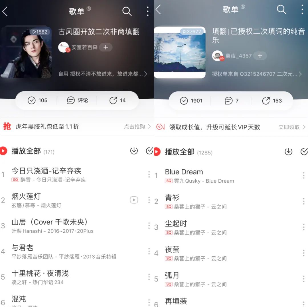 可授权的翻唱不仅相对简单、容易吸粉,也有利于原作品的传播;歌词翻填是对原版权音乐作品的二次创作,很多非商业的广播剧主题曲都采用歌曲;一些音乐社团也很宽容,直接会在微博或者音乐平台挂出可以授权使用的音乐伴奏;网易云上有很多可授权翻填的歌单,有的歌单歌曲多达千首。