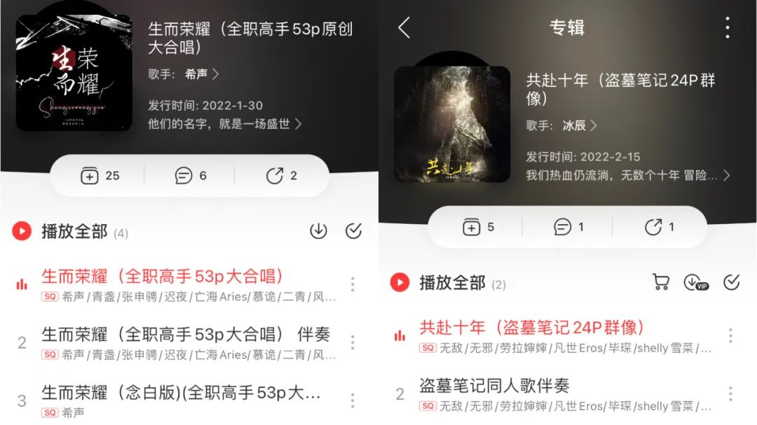 由于线上共创作品有多人参与,通常在发行之初就能凝聚较多的人气,创作参与人员和音乐社交好友也会相互点赞评论,不同创作者的粉丝也会实现一定程度的共享和转移。