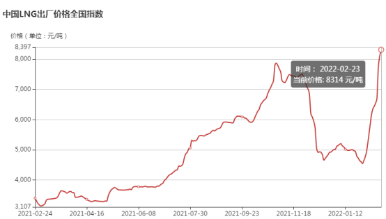 界面新闻从上海石油天然气交易中心获悉,2月23日,中国LNG出厂价格全国指数为8314元/吨,同比上涨1.4倍; 比1月24日的4790元/吨相比,月环比增长67%。