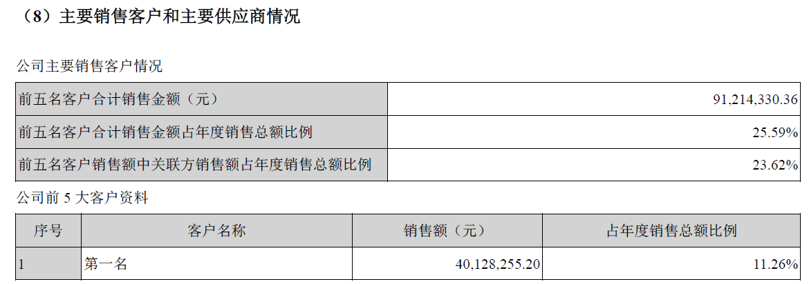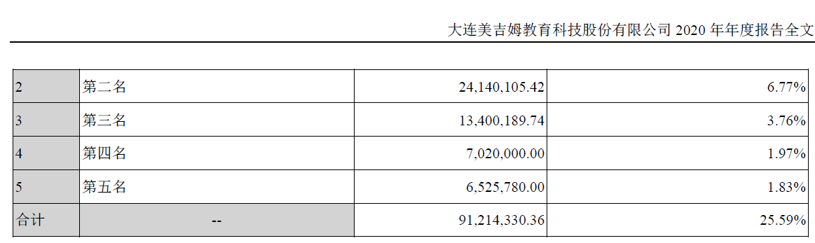 所以自2018年以来,上市公司美吉姆每年都有大量的关联方交易,我们以2020年为例。根据美吉姆2020年财报披露,其2020年前五大客户销售金额9121.43万元,占其销售总额的25.29%,其中关联方销售占比高达23.62%。