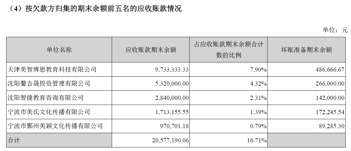 2020年美吉姆的前五大应收客户中,前三大应收单位都是关联方,第四大应收单位宁波市美氏文化传播有限公司和第五大应收单位宁波市鄞州美颖文化传播有限公司都是自然人许杨扬控制的公司,持股比例均为70%。