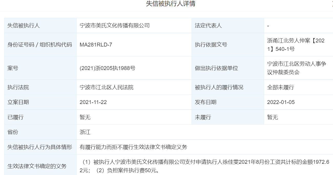 2021年11月,美氏文化及其老板许杨扬因拖欠员工工资被法院判定为失信人: