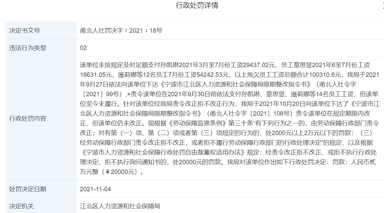 另外,2021年11月,美氏文化因拖欠14名员工工资10万余元,被宁波市江北区人力资源和社会保障局罚款2万元: