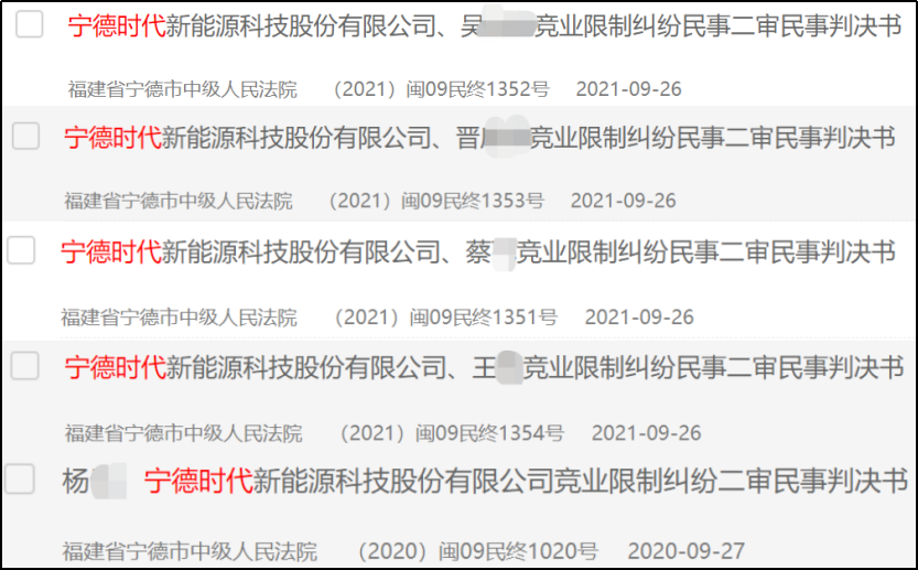 创头条(ID:ctoutiao)通过裁判文书网发现,除小杨外,宁德时代也曾以竞业限制为由,将其他8名跳槽至蜂巢能源的前员工告上法庭。