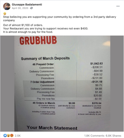 反观海外,去年,美国伊利诺伊斯一家餐厅老板在网上发了一张Grubhub收费截图,截图显示,在当月总额1000多美元的46个外卖订单中,Grubhub抽走了近70%的费用,包括佣金、配送佣金(配送费)、平台处理费、市场营销费等。