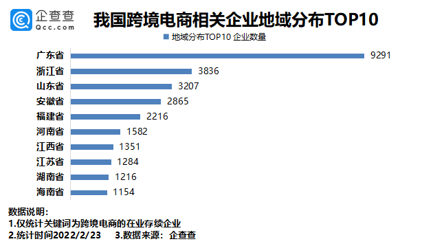 企查查数据显示,从区域分布来看,广东以9291家跨境电商相关企业排名第一,浙江、山东分别有3836家、3207家,排名前三。此后依次为安徽、福建、河南等省份。