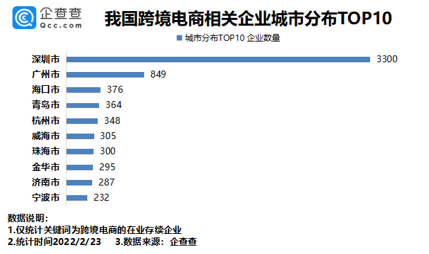 企查查数据显示,从城市分布来看,深圳市有3300家跨境电商相关企业,排名第一。广州、海口分别有849家、376家,排名前三。此后依次为青岛、杭州、威海等城市。