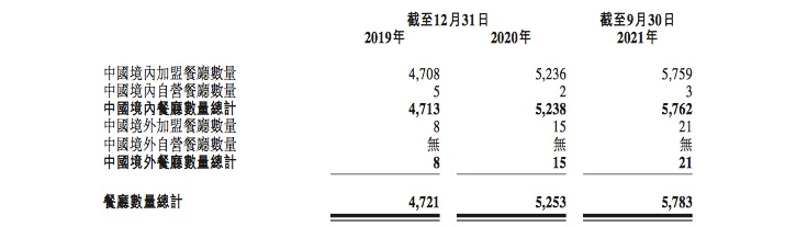 自2020年初以来受到COVID-19疫情及其变种爆发的影响,其加盟餐厅业务线产生的收入于往绩记录期持续增长。有关收入由2019年的10.4亿元(人民币,下同)轻微增加至2020年的10.6亿元,并由截至2020年9月30日止九个月的6.7亿元增加64.4%至2021年同期的11亿元。