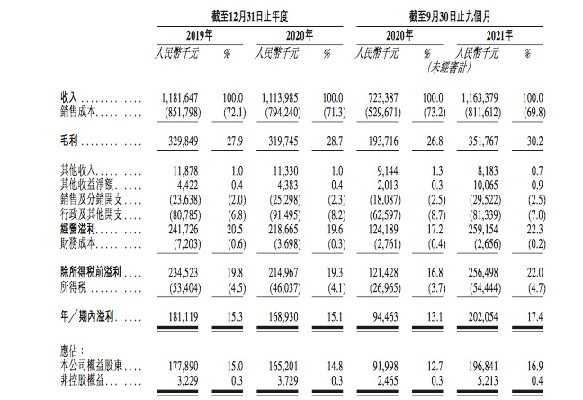 受自营餐厅及其他业务线产生的收入波动影响,公司于2019年及2020年以及截至2020年及2021年9月30日止九个月的总收入分別为11.8亿元、11.1亿元、7.2亿元及11.6亿元。受经济规模等因素的影响,公司的毛利率于往绩记录期持续增长,由2019年的27.9%增加至2020年的28.7%,并由截至2020年9月30日止九个月的26.8%增加至2021年同期的30.2%。