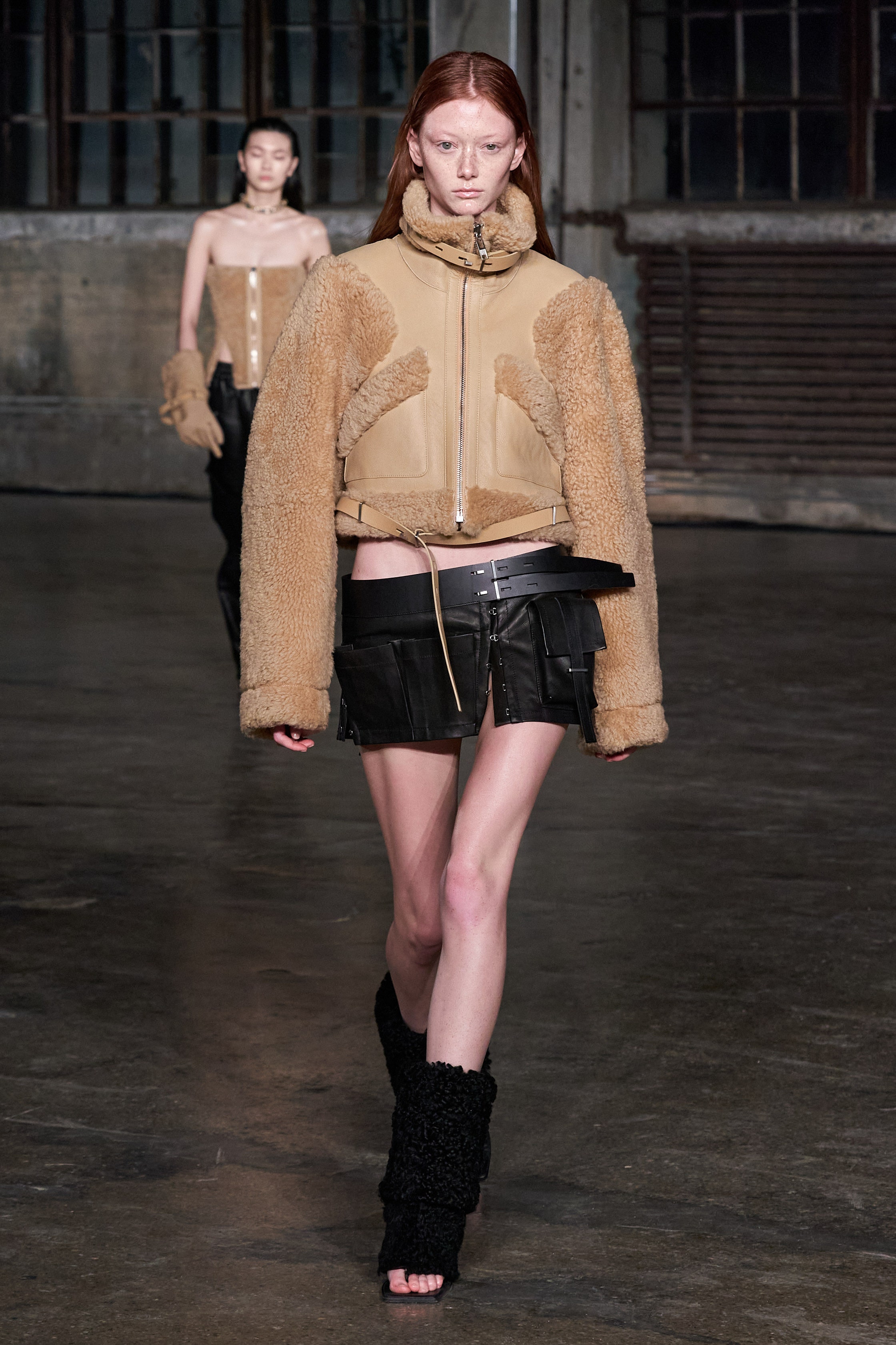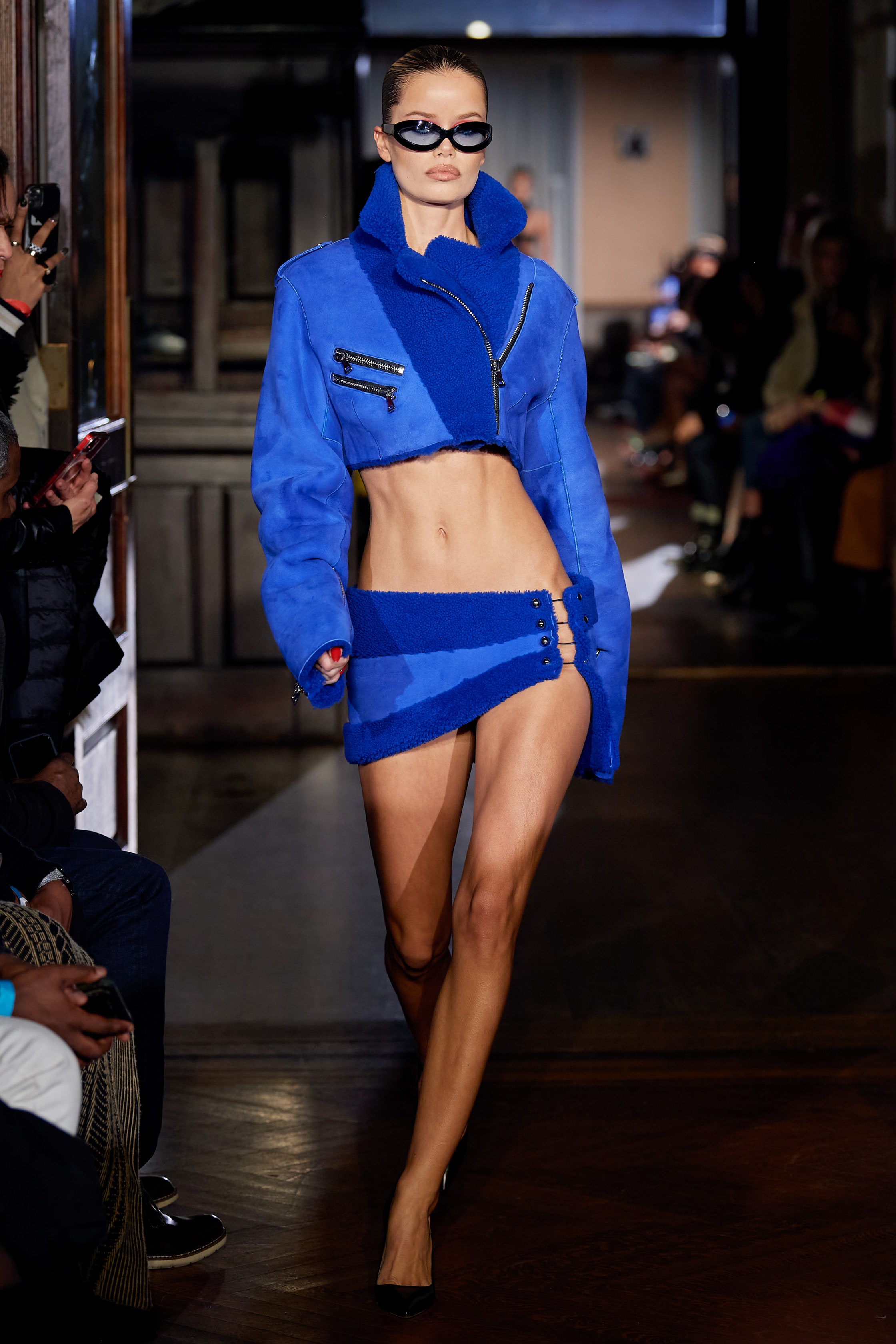 来自纽约的LaQuan Smith也做有类似Miu Miu露脐装的造型,但设计师采用大面积蓝色绒面料和皮面拼接,同时选择搭配拉链和环扣细节来营造出酷劲。而Dion Lee也选择了在上装拼接元素,但在裙装上通过加入口袋元素,来带出街头风格。
