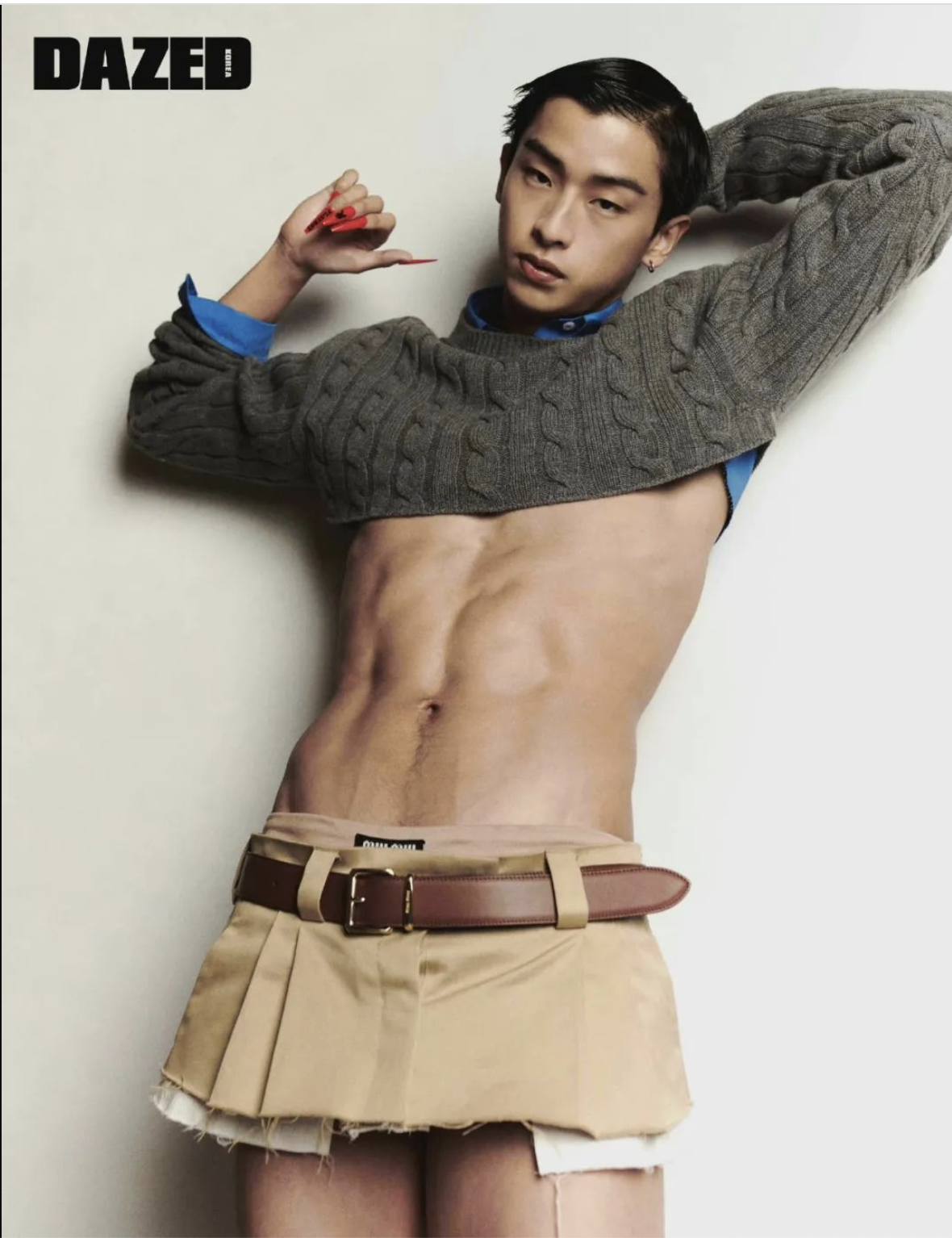 在时装秀举办后,模特EmRata和Hailey Bieber分别穿着这套露脐装出现在公众活动和Miu Miu广告中,带来了最初的曝光。一组来自韩国版Dazed的时尚大片则引爆了关注度,大片中的男模穿着Miu Miu露脐装的造型带来了极强冲突感和新鲜感。