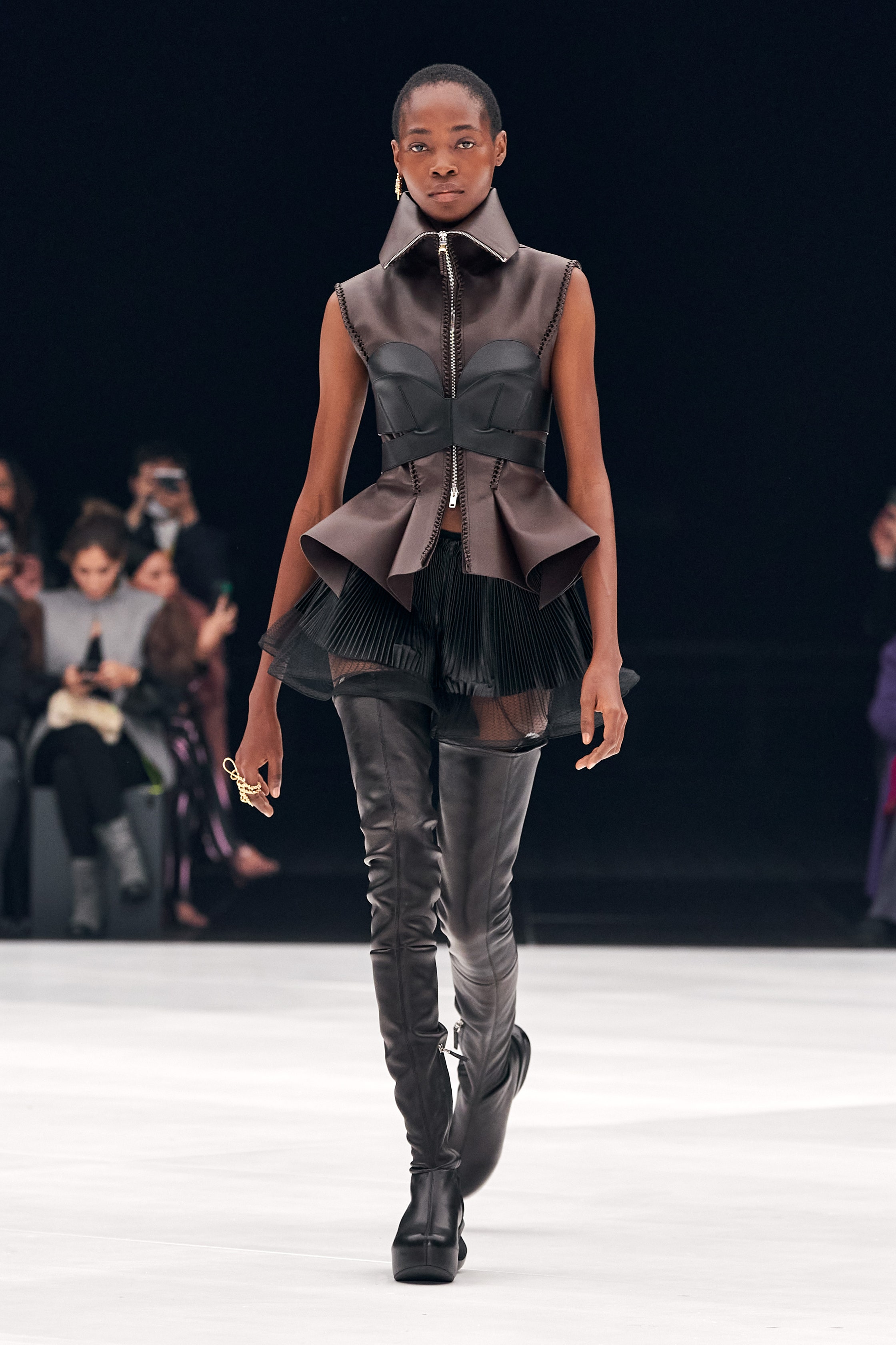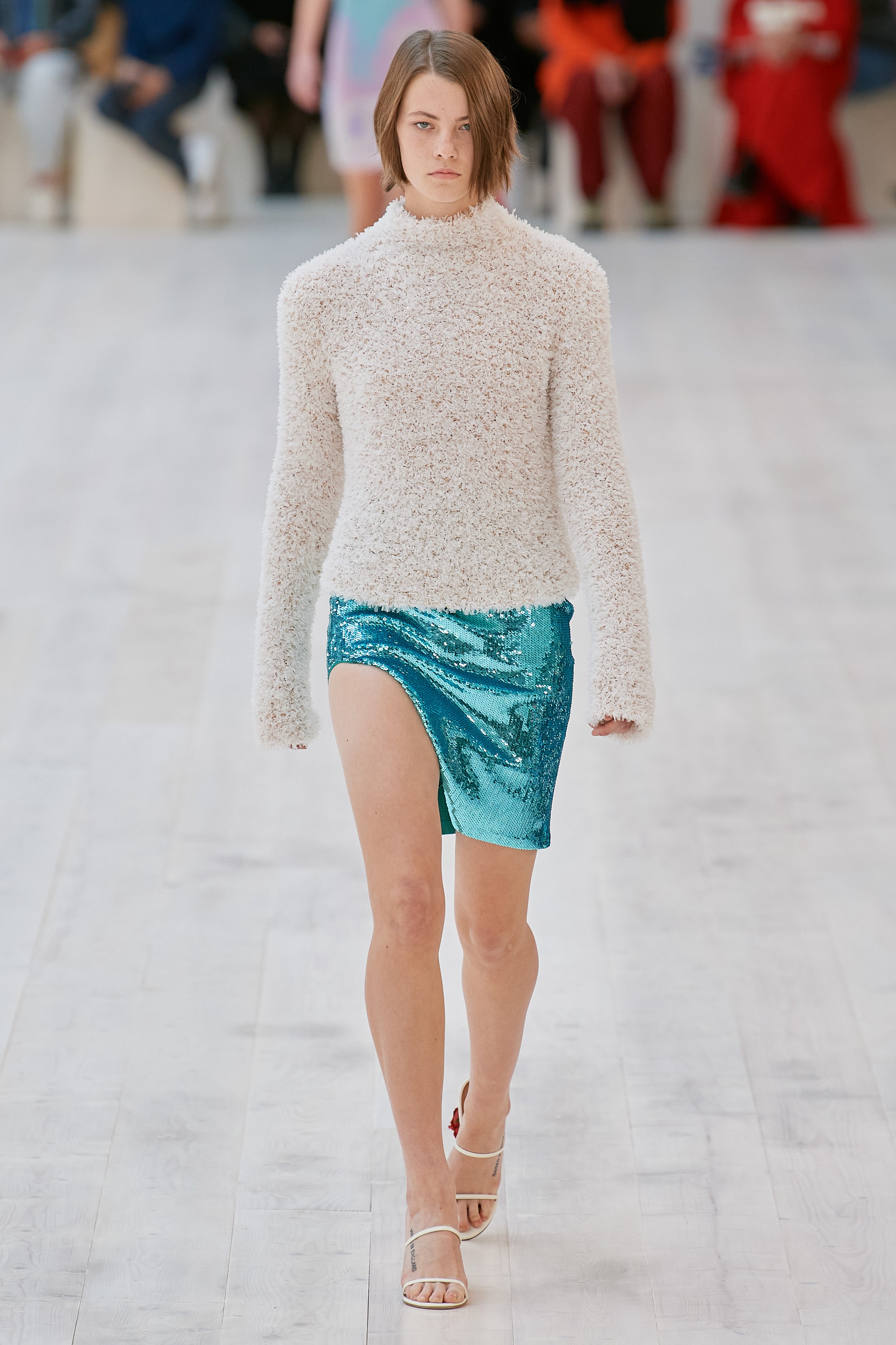 若你想寻找一些适合通勤的迷你套装,Loewe或Bottega Veneta许是个不错的选择。鲜艳的蓝色和鹅黄色对应日渐温暖的天气,光泽亮面则颇具趣味。Givenchy的半透明迷你裙带有更多的褶皱装饰,流露出水波般的质感。