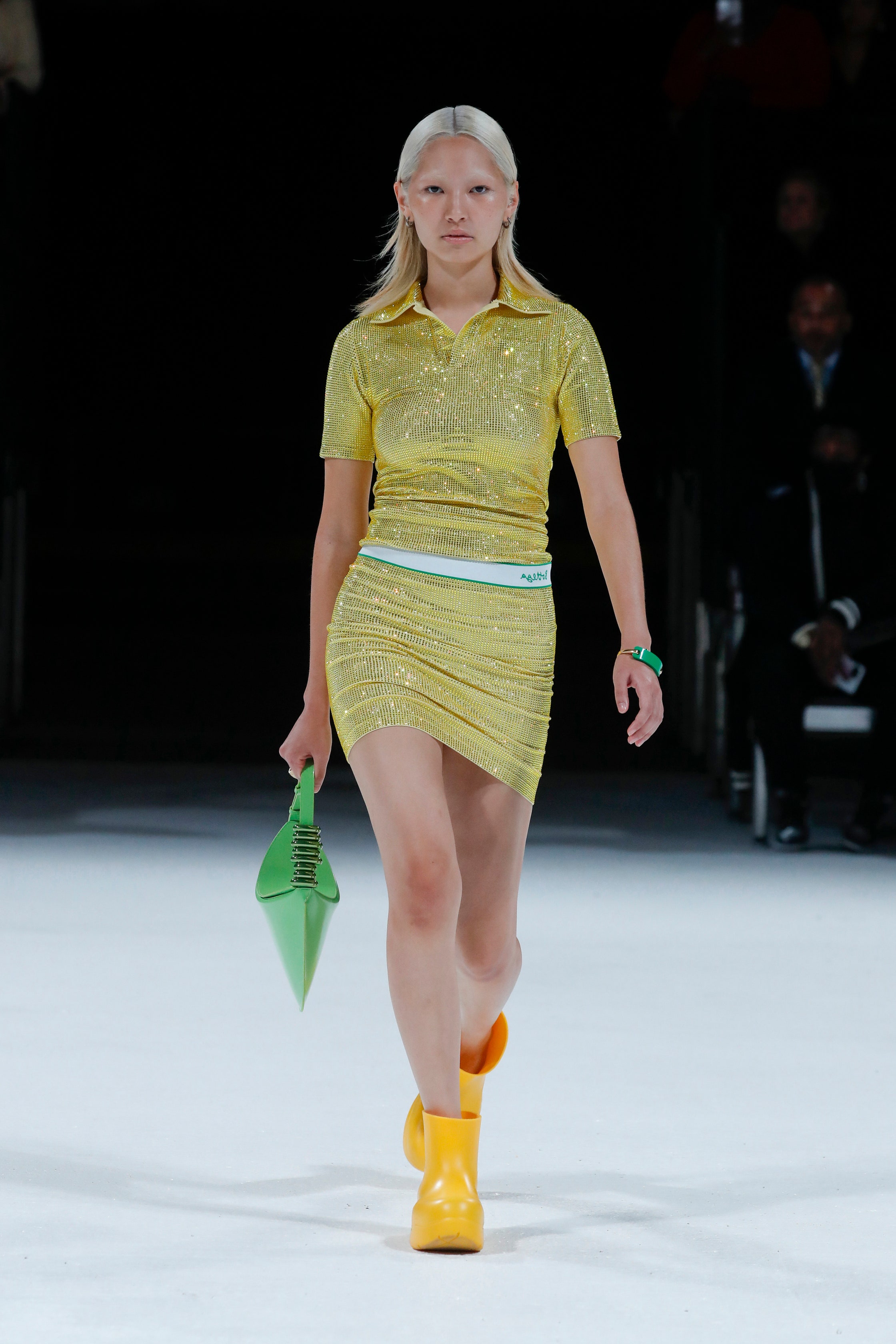 事实上,它的设计手法足够有吸引力。超短的裙装采用褶皱手法营造出2000年前后“Teen Pop”青春偶像的模样,承接过去几年流行的Y2K风格。看似未完成的裁剪手法让裙装带有随意感,搭配深色腰带则使其显现出中性特征。