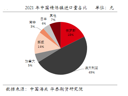 中国海关数据显示,2021年中国自俄罗斯进口精炼镍4.6万吨,占中国精炼镍进口量比例约为18%,同比下滑11%。