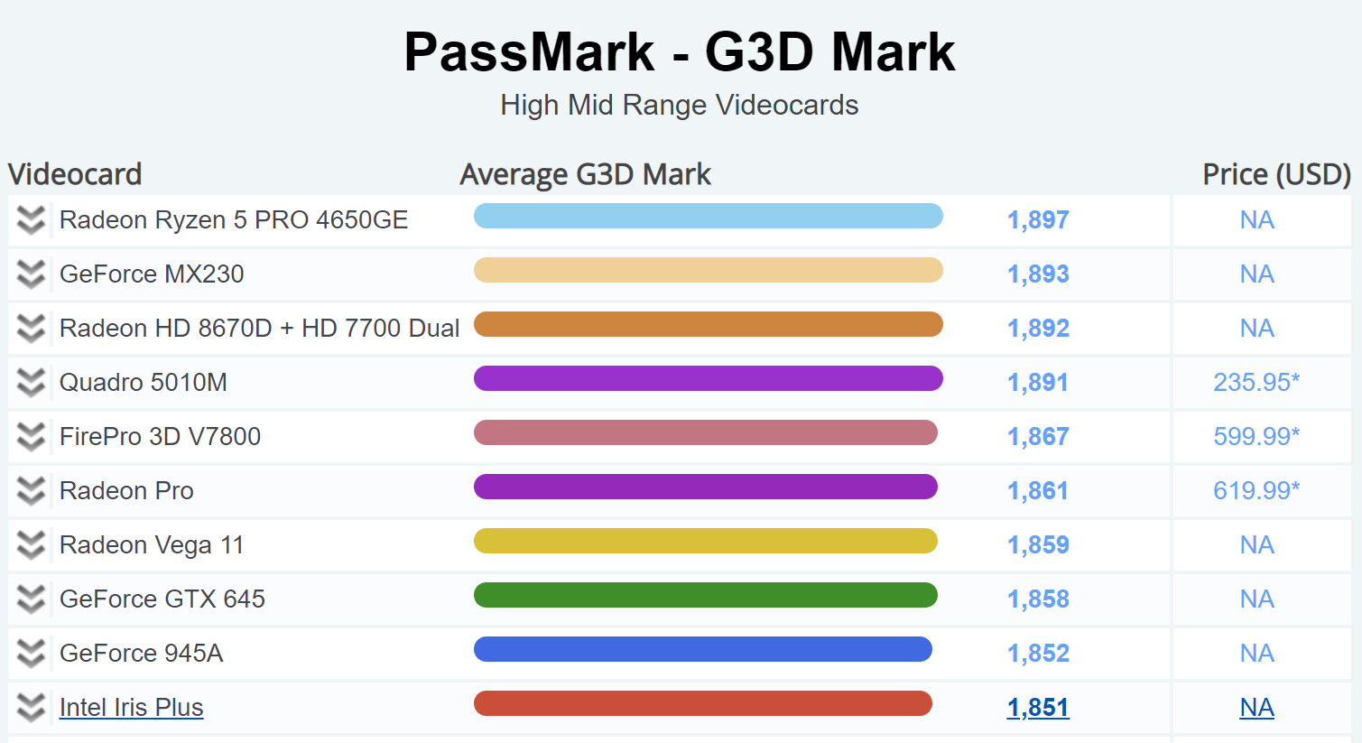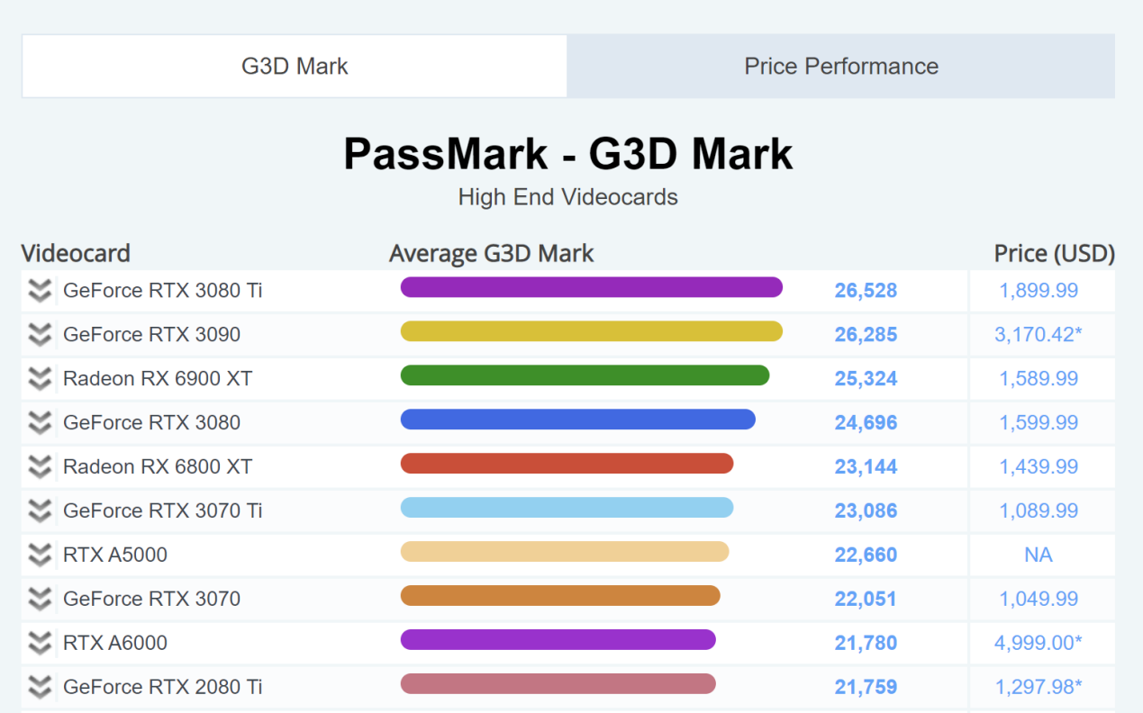 根据PassMark的GPU评分可以看到,在高端中端显卡市场,AMD的产品与英伟达的产品已经有了不相上下的表现。