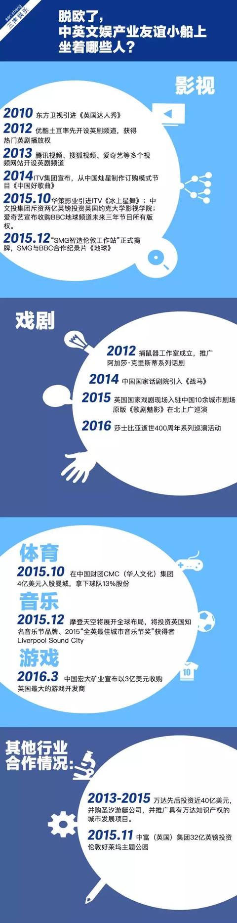 实际上,单纯项目层面的交流和交易已经存在很长时间,从2015年开始,中国文娱产业大佬和公司在英国市场的投入开始加大,华人文化、万达、华策等公司已经开始进入实际布局。
