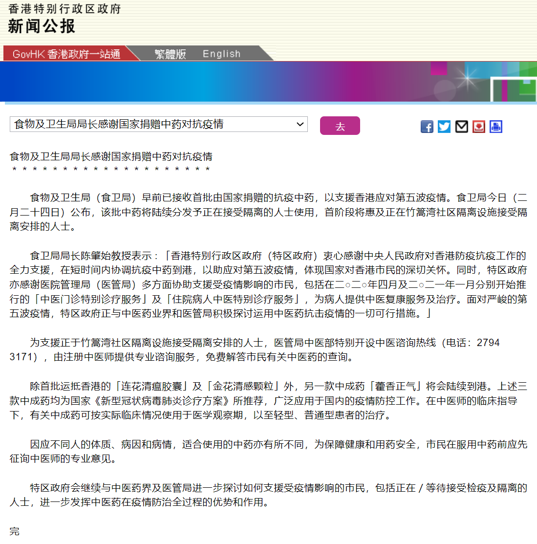 食卫局局长陈肇始教授表示∶“香港特别行政区政府衷心感谢中央人民政府对香港防疫抗疫工作的全力支援,在短时间内协调抗疫中药到港,以助应对第五波疫情,体现国家对香港市民的深切关怀。同时,特区政府亦感谢医院管理局(下称医管局)多方面协助支援受疫情影响的市民,包括在二○二○年四月及二○二一年一月分别开始推行的‘中医门诊特别诊疗服务’及‘住院病人中医特别诊疗服务’,为病人提供中医复康服务及治疗。面对严峻的第五波疫情,特区政府正与中医药业界和医管局积极探讨运用中医药抗击疫情的一切可行措施。”