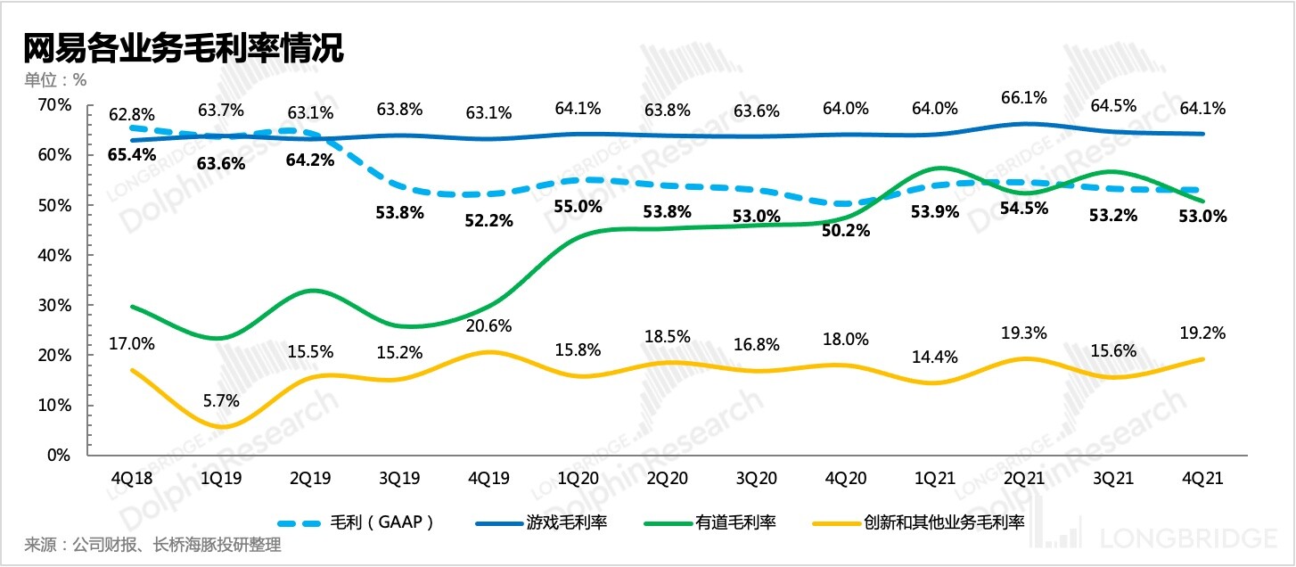 教育业务是今年监管重点,因此有道的日子很难好过。在上季度公司就已经在寻求积极转型,宣称 2021 年底将彻底关闭义务教育业务。从四季度业绩来看,少了 K12 精品课的有道,收入自然被削去了不少。服务类收入占比下降后,也影响了有道的毛利率水平。