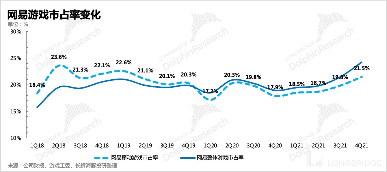 在版号继续暂停的四季度,无论是当期确认收入还是流水情况,网易的表现也比同行要好看太多,因而也进一步提升了市占率。四季度整体行业增速在降至 1.5%,而从递延收入估算而来的当季流水净增情况来看,网易流水同比增长 14%,当然《哈利波特》、《永劫无间》是主要推动力。