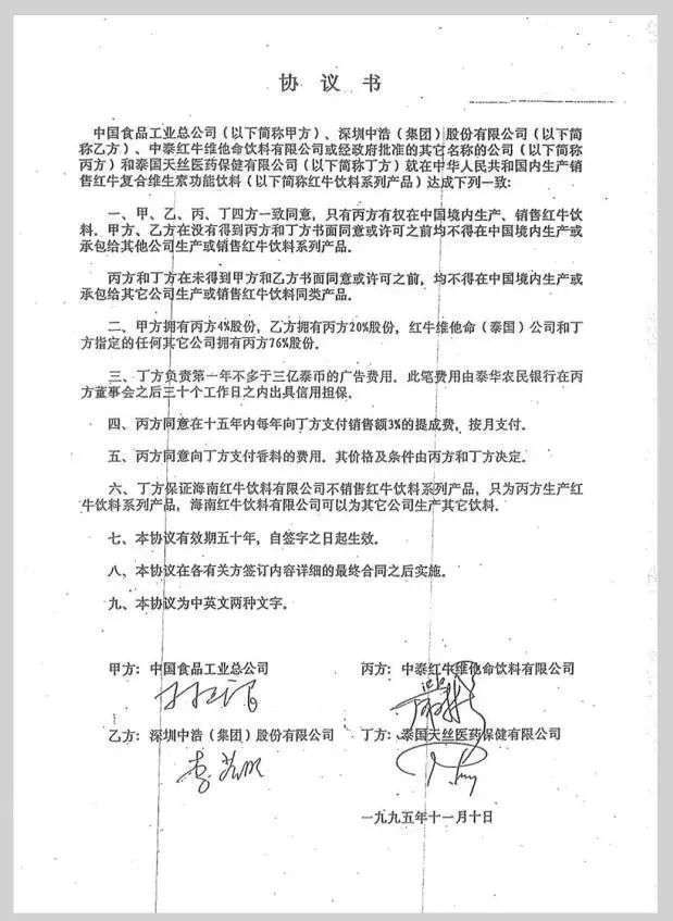红牛公司称,1995年,中泰各方曾坐在谈判桌前,签订了这份至今成为关键证据的50年《协议书》。