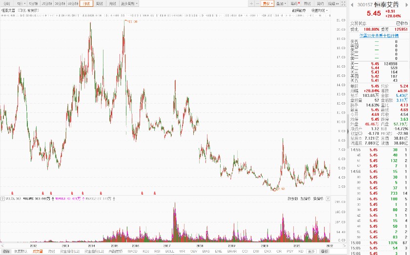 恒泰艾普的主要业务包括核心精密仪器和高端装备制造、油气勘探开发专业软件、工程作业技术服务、油气资产等。受外部市场影响,2月24日恒泰艾普股价在开盘后快速上涨,上午10点之前即“封死”涨停板直至下午收盘,收于5.45元/股,涨幅20.04%,全天成交103.65万手、5.43亿元,换手率14.63%。