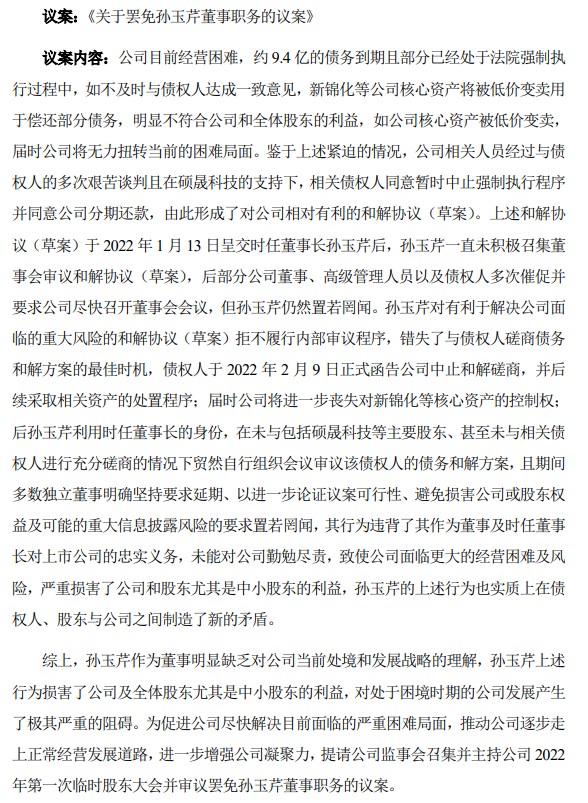 早在2月14日,孙玉芹辞去上市公司董事长、法定代表人的职务,继续担任董事、总理经职务。不过,控股股东硕晟科技对此显然还不满意,仍要罢免孙玉芹董事职务。根据议案内容,上市公司恒泰艾普目前经营困难,约9.4亿债务到期且部分已经处于法院强制执行过程中;在硕晟科技的支持下,相关各方形成了相对有利的和解协议(草案);时任董事长孙玉芹一直未积极召集董事会审议该草案,错失了与债权人磋商债务和解方案的最佳时机。基于此,议案提请审议罢免孙玉芹董事的职务(如下图所示)。