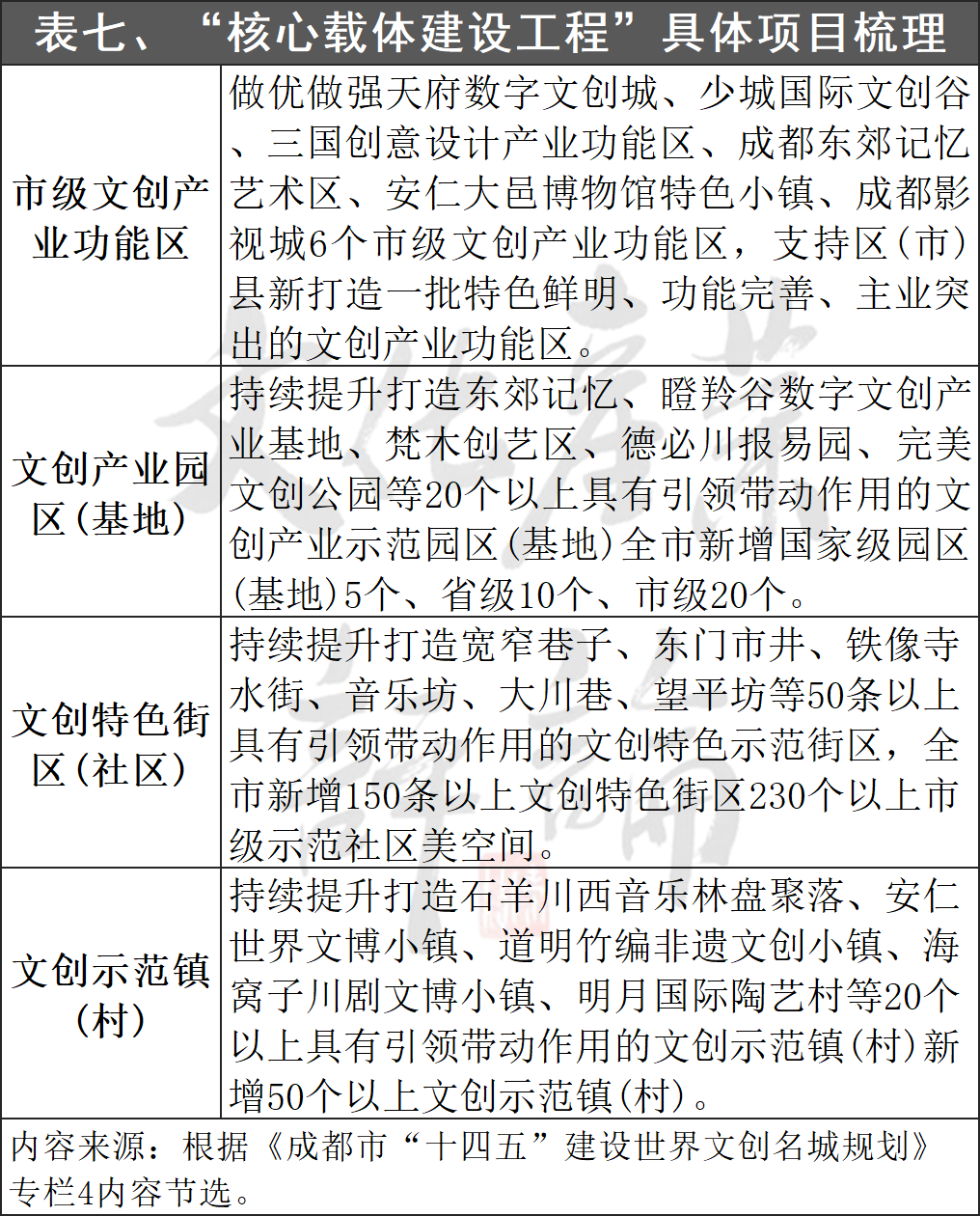 为确保世界文创名城建设部署落地落实,《规划》还系统提出,“十四五”时期,成都将重点开展天府文化引领工程、核心载体建设工程、文创金融深度融合工程、文创市场主体培育工程、公共文化服务提升工程、文化消费潜力激发工程、对外文化交流合作工程等七大支撑工程,全力推动全市文创产业高质量发展。