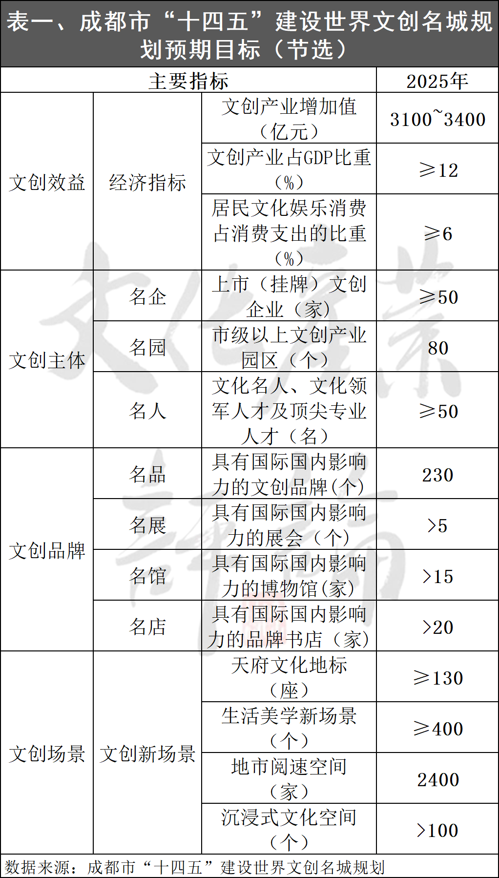 《规划》对标文创效益、文创主体、文创品牌、文创场景等国际化标准体系提出,到2025年,成都文创产业增加值将达到3100亿元~3400亿元;上市(挂牌)文创企业不低于50家,市级以上文创产业园区达80个;具有国际国内影响力的文创品牌不低于30个。