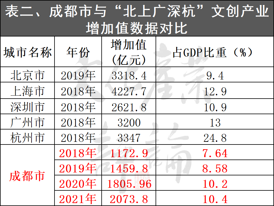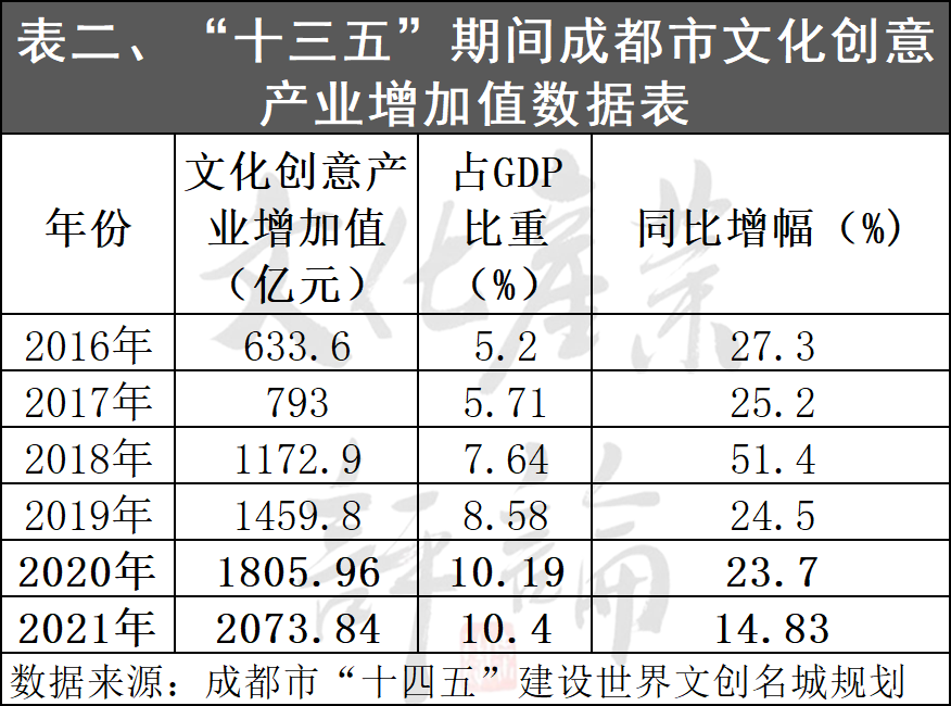 《规划》在背景提到,成都文化创意产业增加值从2016年的633.6亿元到2020年的1805.96亿元,增长近3倍,2020年文创产业增加值占GDP比重首次突破10%。2021年全市文创产业增加值实现2073.84亿元,首次突破2000亿元大关,同比增长14.83%,占全市GDP10.4%,每年保持两位数增长(详见表二)。