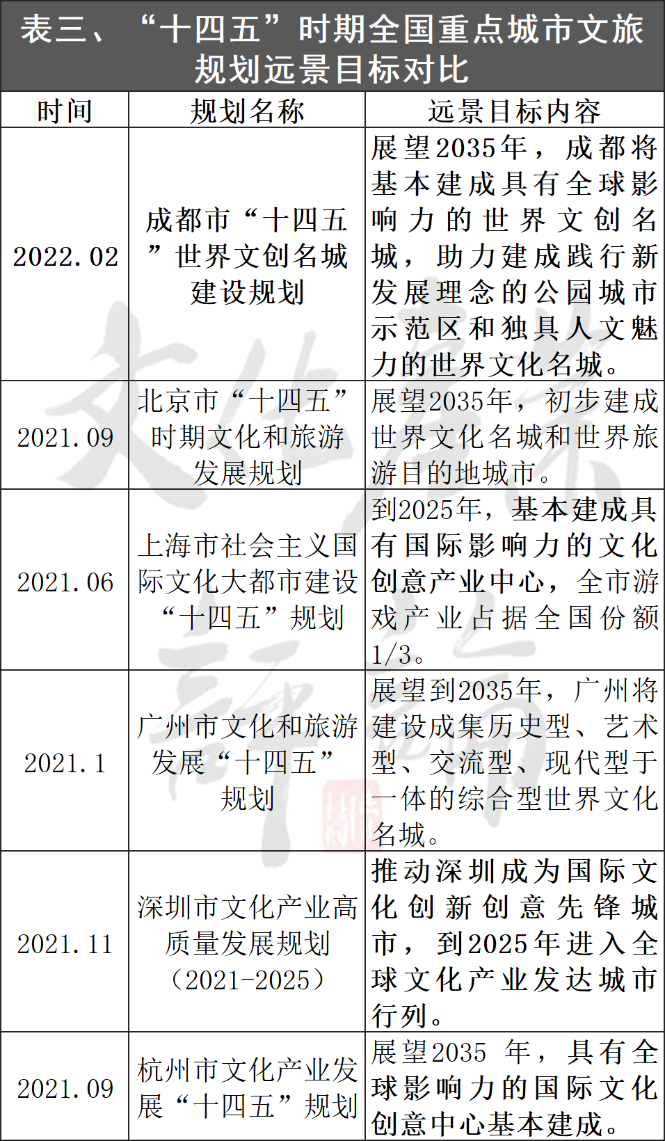 如,《杭州市文化产业发展“十四五”规划》提出,展望2035 年,具有全球影响力的国际文化创意中心基本建成。《深圳市文化产业高质量发展规划(2021-2025)》提出,推动深圳成为国际文化创新创意先锋城市,到2025年进入全球文化产业发达城市行列。
