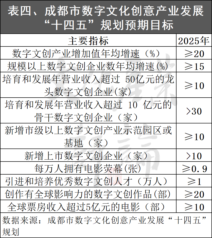 值得注意的是,在强化数字文创引领方面。此前成都发布的《成都市数字文化创意产业发展“十四五”规划》就提出,打造中国最适宜数字文创发展城市,实施数字文创腾飞计划,推出一批吸引力强的数字文创产业园区(基地),建成一批创新示范、辐射带动能力强的数字文创产业重大项目和平台,建成一批数字文创现代产业集群,推动数字文创产业从“盆地”走向“高地”。