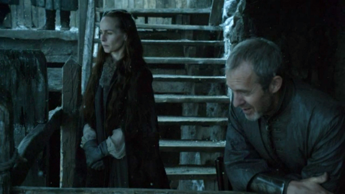 另一次质疑这件事是在第五季的时候。史坦尼斯·拜拉席恩和他的妻子赛丽丝在一起讨论着雪诺和他的出身。