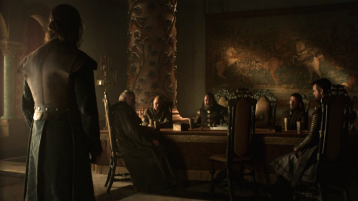 劳勃和奈德在一起回忆儿时的时光,讨论他们的性征服力。“你的是梅丽尔?你那个私生子的母亲?”劳勃试着猜测,暗指雪诺。奈德的脸一下子暗下来。奈德说:“是薇拉。”然后就没再说什么了。