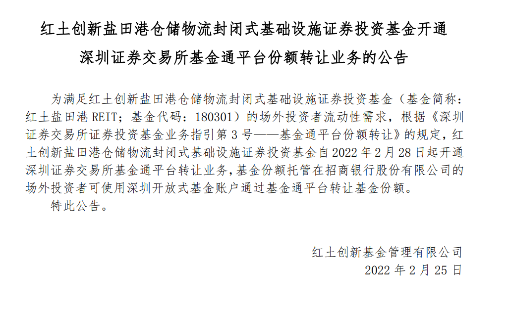 今日,平安广州广河REIT、红土盐田港REIT、博时蛇口产园REIT等6只在深交所上市的公募基础设施产品相继发布了《开通深交所基金通平台份额转让业务的公告》,宣布自2月28日(下周一)起开通深交所基金通平台份额转让业务,场外投资者可以使用深圳开放式基金账户通过基金通平台转让基金份额。