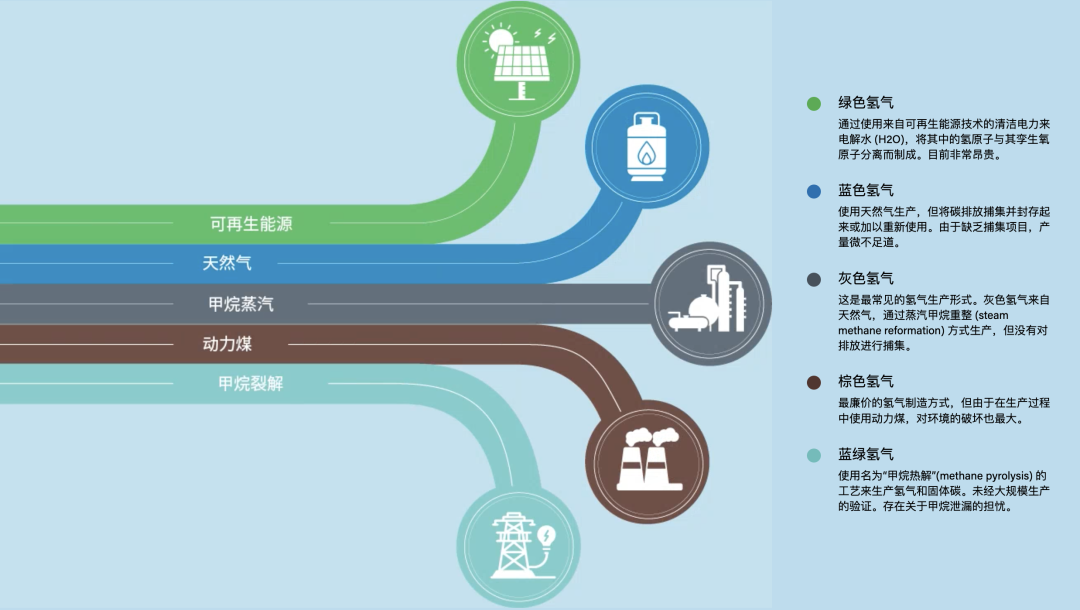 《经济学人》杂志根据每一种氢气生产过程中二氧化碳的排放水平,把氢气分成了5大类——绿色氢气、蓝色氢气、灰色氢气、棕色氢气和蓝绿氢气。