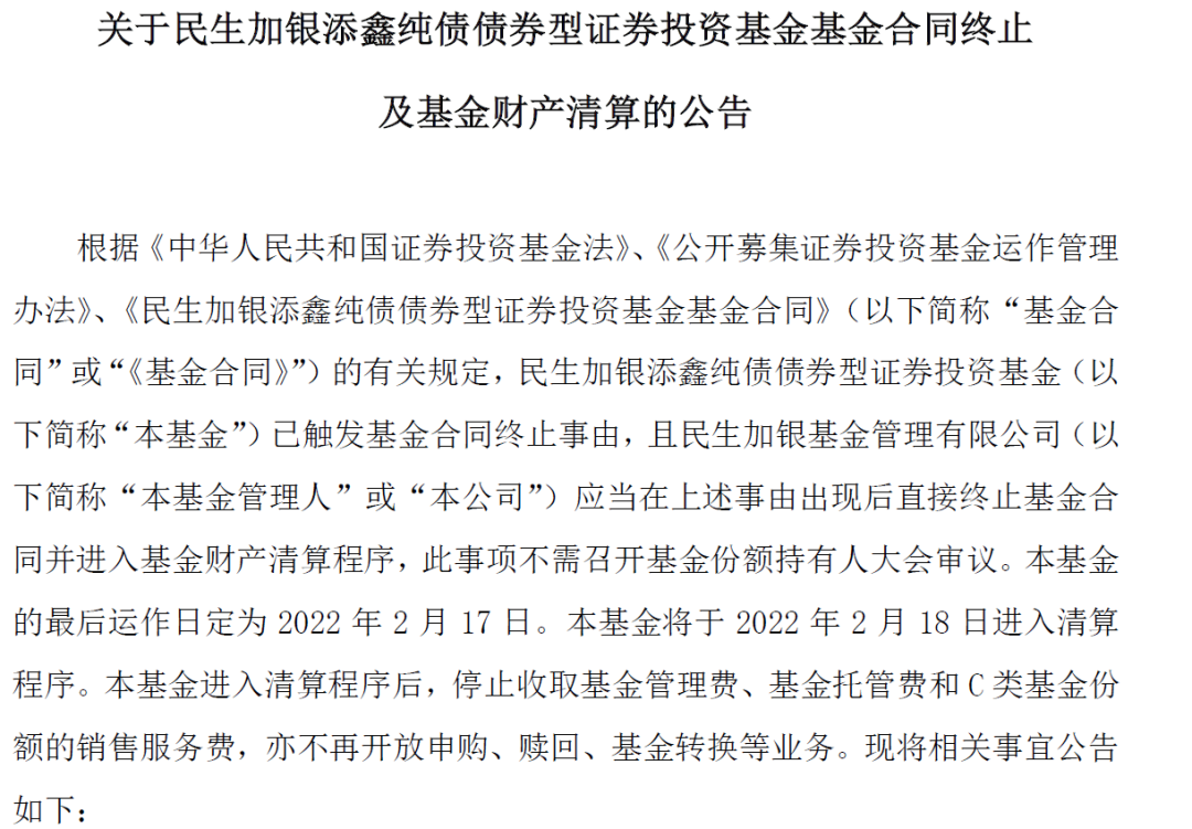 因规模不足5000万元,民生加银旗下债基触发清盘