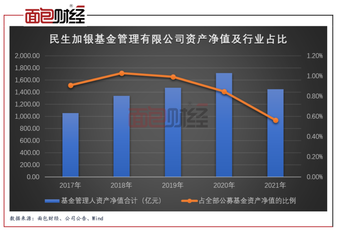 查阅近五年的资产净值发现,民生加银基金2017年至2020年的资产净值整体处于上升趋势,但2021年出现明显下降。对比来看,公募基金行业的整体规模则从2020年约20万亿元大幅上升至2021年突破25万亿元。一涨一跌共同作用下,民生加银基金的行业资产净值占比在2021年出现大比例下滑。