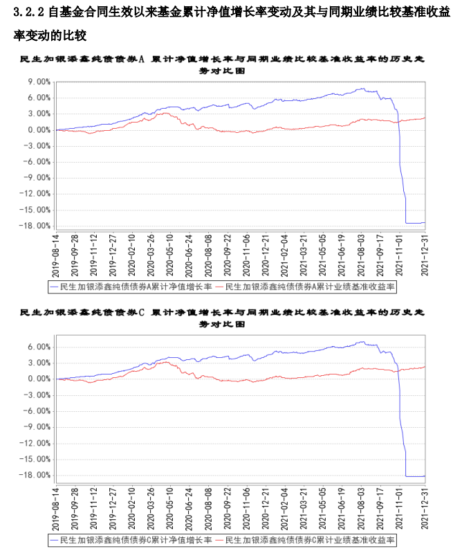 数据显示,2021年下半年,民生加银添鑫纯债债券A、民生加银添鑫纯债债券C的净值陡然下降,最终分别录得当年亏损21.43%和21.73%,也远远跑输同期的业绩基准收益率。从单月业绩来看,基金净值大幅下跌主要发生在2021年11月。