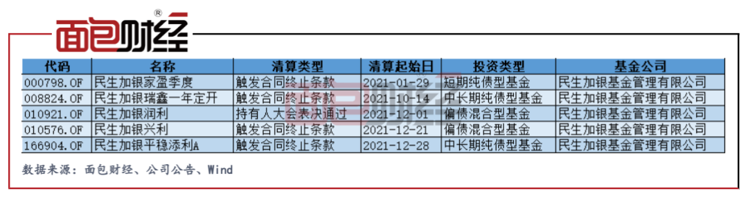数据显示,按照清算起始日测算,民生加银基金2021年共有5只基金清算(初始基金口径),其中4只因为触发合同终止条款,1只因为持有人大会表决通过。