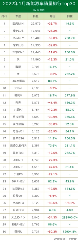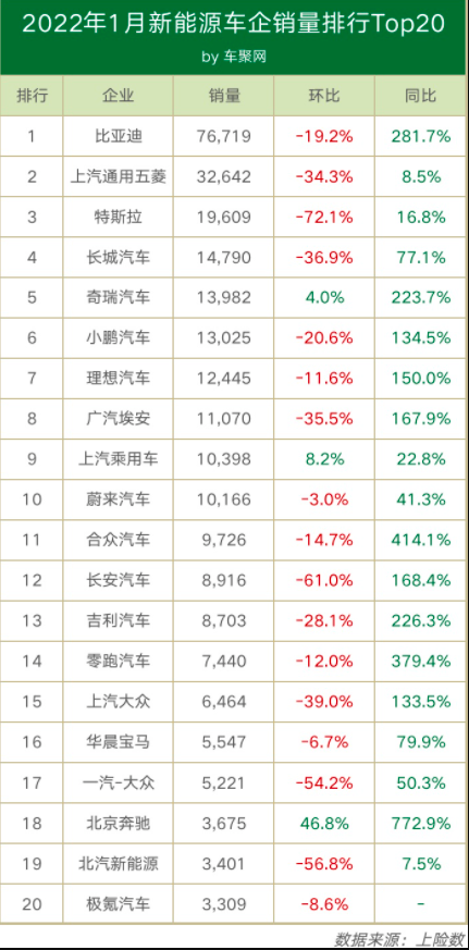 当然,下滑的不仅仅只是特斯拉,绝大部分新能源车企也都如此。如榜首的比亚迪,1月销量环比下滑了19.2%,不过,它7.7万辆的成绩遥遥领先——是第二位五菱的近1.5倍,更是第三位特斯拉的近4倍。