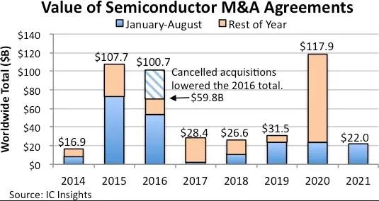 知名分析机构IC Insights数据显示,2020年半导体并购总金额达到1180亿美元的历史新高,尤其在7月之后,总价值为940亿美元的五笔并购相继宣布,这开启了新一轮的并购整合浪潮。2021年第一季度与半导体公司有关的收购协议达到158亿美元,而数据统计到的在2021年1-8月期间共宣布了14项半导体收购公告,与2020年同期持平。