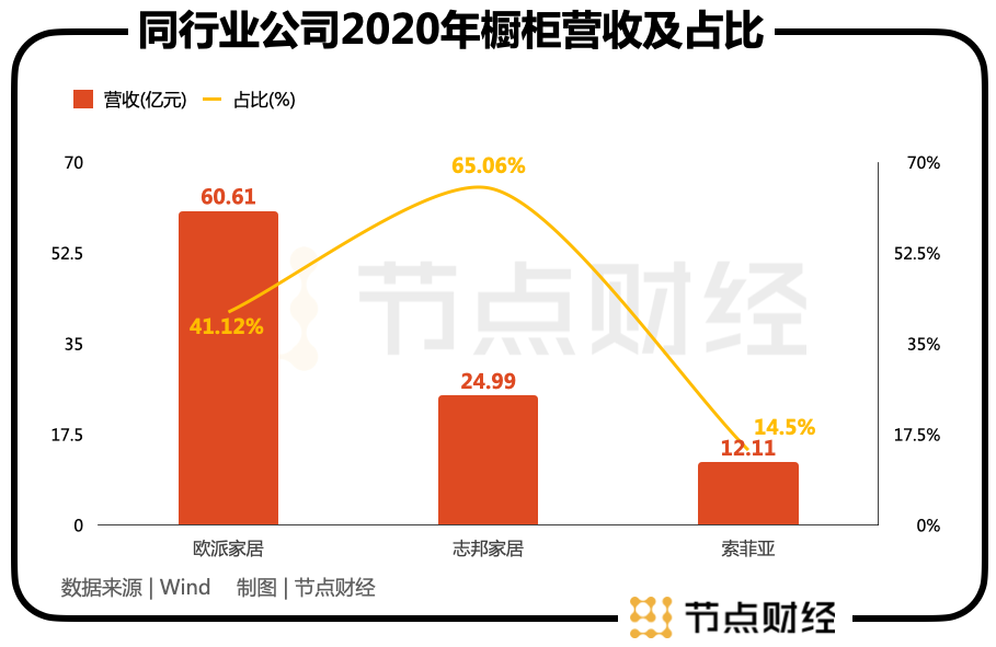 体现在市盈率上,截至2月23日,欧派家居、志邦家居、索菲亚的动态市盈率分别为27.64、21.87、18.88,市净率分别为5.63、3.73、3.36,市场赋予的估值顺序依次是欧派家居>志邦家居>索菲亚,对应2020年橱柜业务收入占比分别为41.12%、65.06%、14.5%。