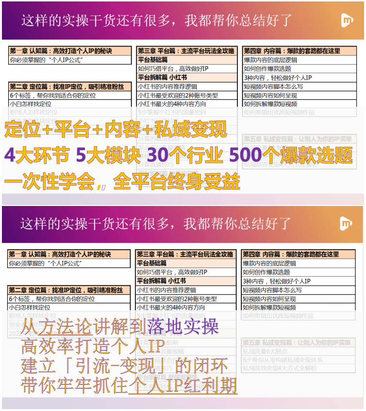 如果忽略这些颇具诱惑力的宣传语,据该训练营的所讲,他们针对个人IP的打造,已经找到了一个万能公式,即定位+平台+内容+私域变现,“我们最重要&明确自己的定位,可以帮别人解决什么样的问题,进而通过一些公域(抖音、小红书、知乎)等平台,发布一些对用户有价值、有份量的信息(普通人容易复制的心法),最后引导到私域(个人微信)实现变现,形成一个闭环”。
