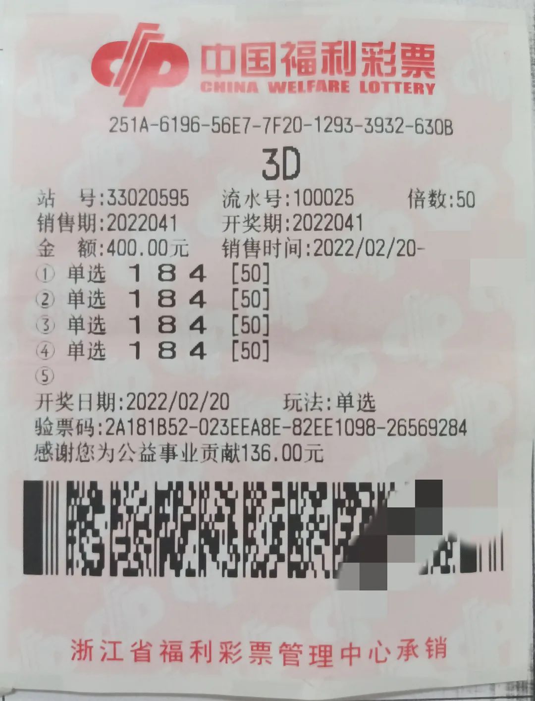 2022年2月21日上午,福彩“3D”第2022041期200注单选奖获得者陈先生现身宁波市福彩中心,兑领了276000元奖金。在办理兑奖手续的过程中,工作人员细看票面发现,这是张面值为400元单选玩法票,票面中只有“1、8、4”这组号码,整齐排列于①-④栏之中。可能是对于自己选择的号码太有信心,陈先生对这组“1、8、4”一共投了200倍,成为了当期宁波地区最大的幸运儿。