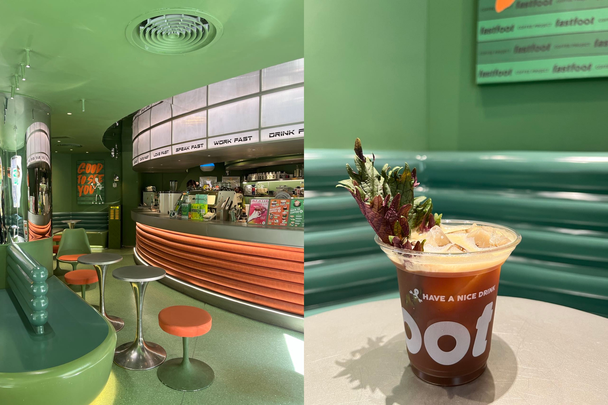 位于六运小区中央的“急急脚㗎啡公司”被精心设计过。无论是店门的座位,造型别样的大门,霓虹灯款式的招牌,还是店内地砖、吧台等都被不同层次的绿色元素所覆盖。主打复古风的装潢,好像让人一不小心就“滑”进80年代的disco溜冰场,遛完之后,你需要坐下来喝一杯创意咖啡饮品。