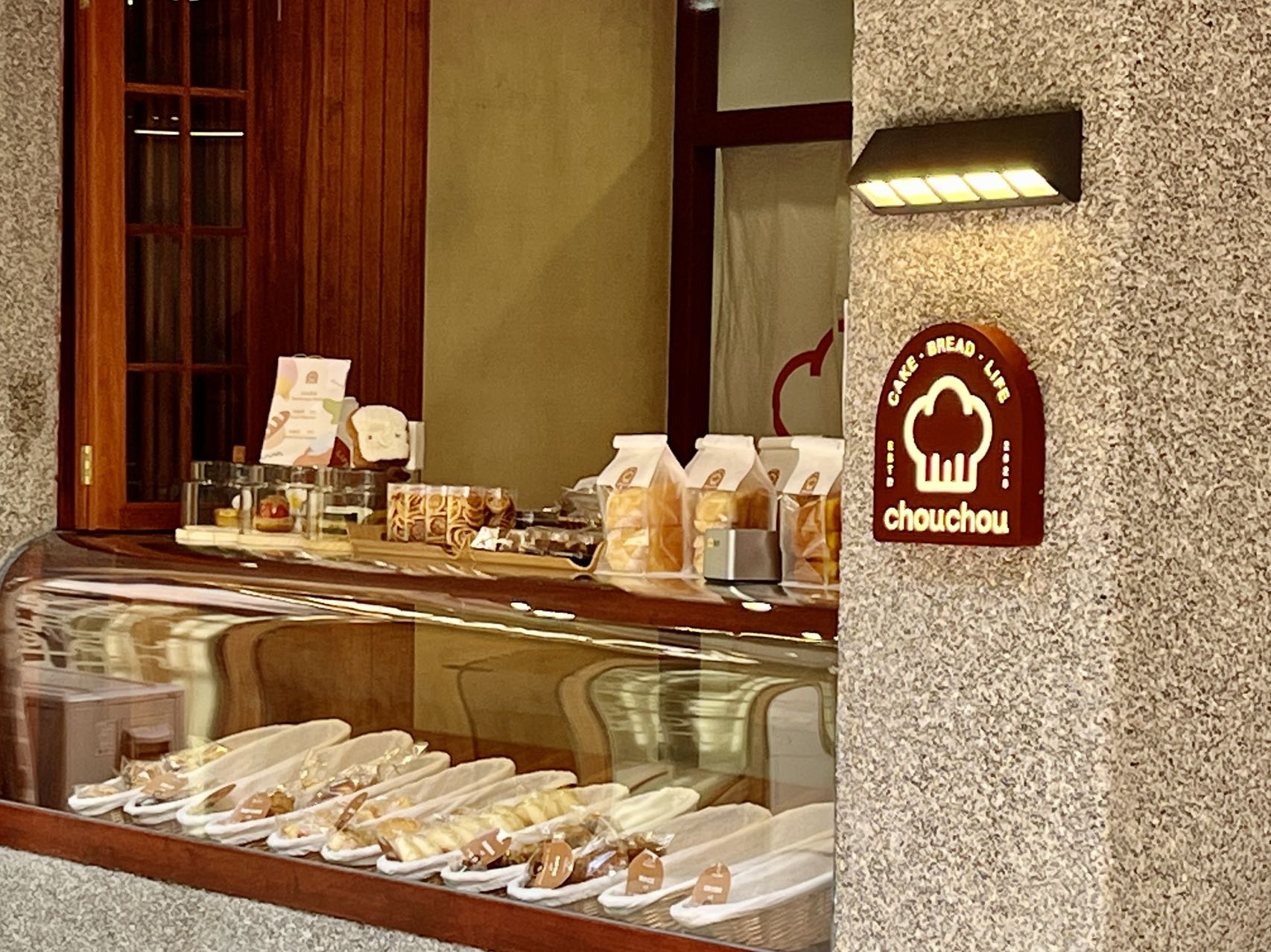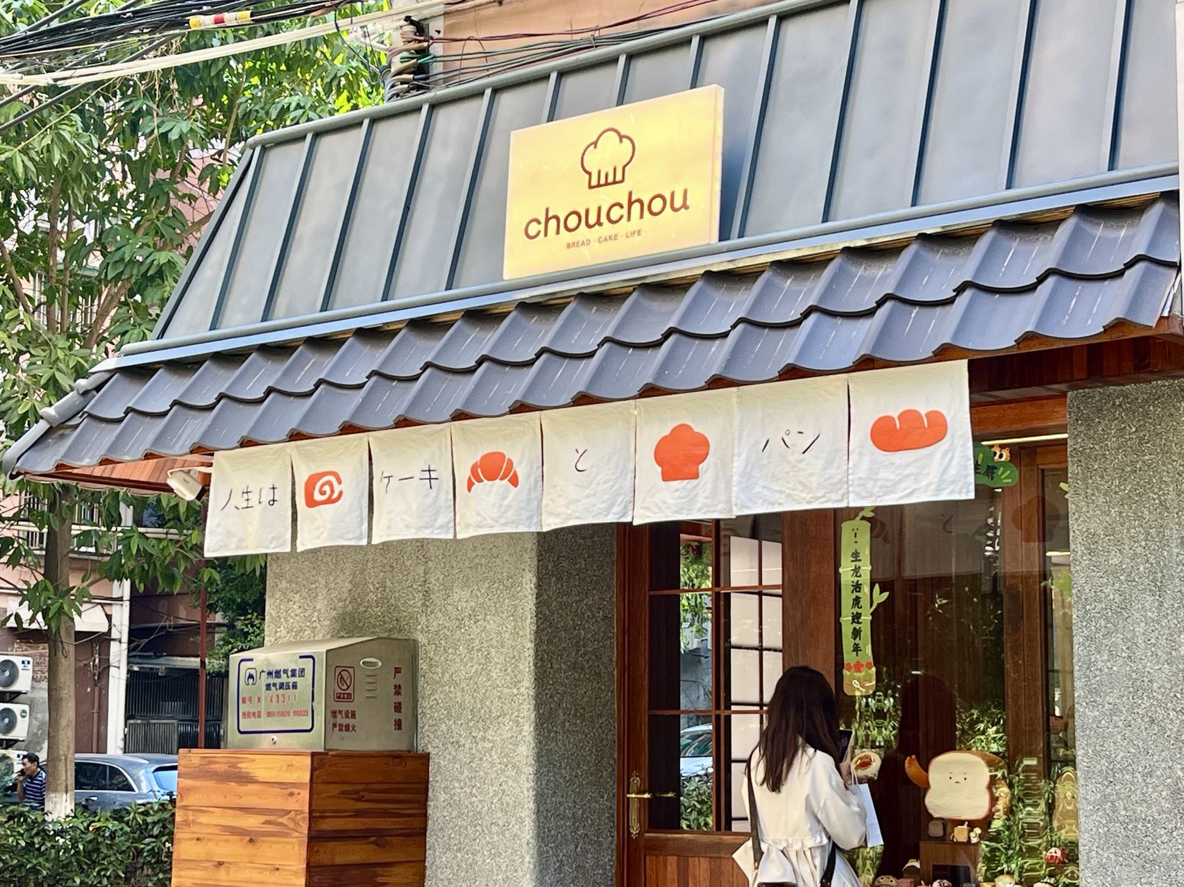 再往前走一些,迎接吴芳的是透出微黄灯光的小屋,一家名为“chouchou”的日系面包店开在这里。跟店名一样,装修风格走的日式治愈路线,灰色的房檐下,米色的贴幅在风中轻轻晃动,核桃色的推拉木门前,随意地摆放着几张椅子。