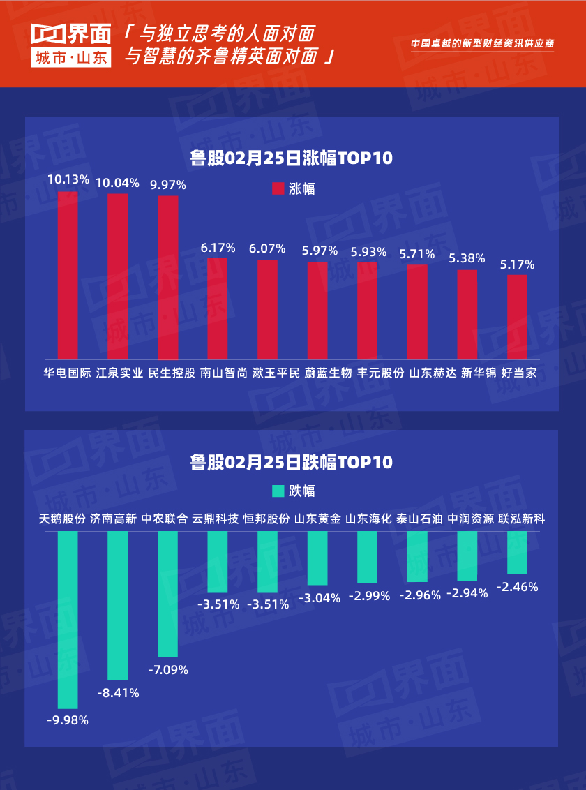 2月25日,山东省内沪深股票有184只个股上涨,71只个股下跌;总市值过千亿的有万华化学(600309)、海尔智家(600690)、歌尔股份(002241)、兖州煤业(600188)、潍柴动力(000338)、中航沈飞(600760)、青岛啤酒(600600)共7家,500亿-1000亿的共有5家,分别是山东黄金(600547)、华熙生物(688363)、中泰证券(600918)、华鲁恒升(600426)、南山铝业(600219)。