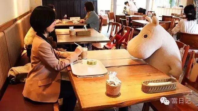 和荷兰餐厅EENMAAL只服务单人顾客不同,日本有一家咖啡屋,怕单独来的客人孤单,为他们提供一个大毛绒玩具,陪他们一起吃饭。